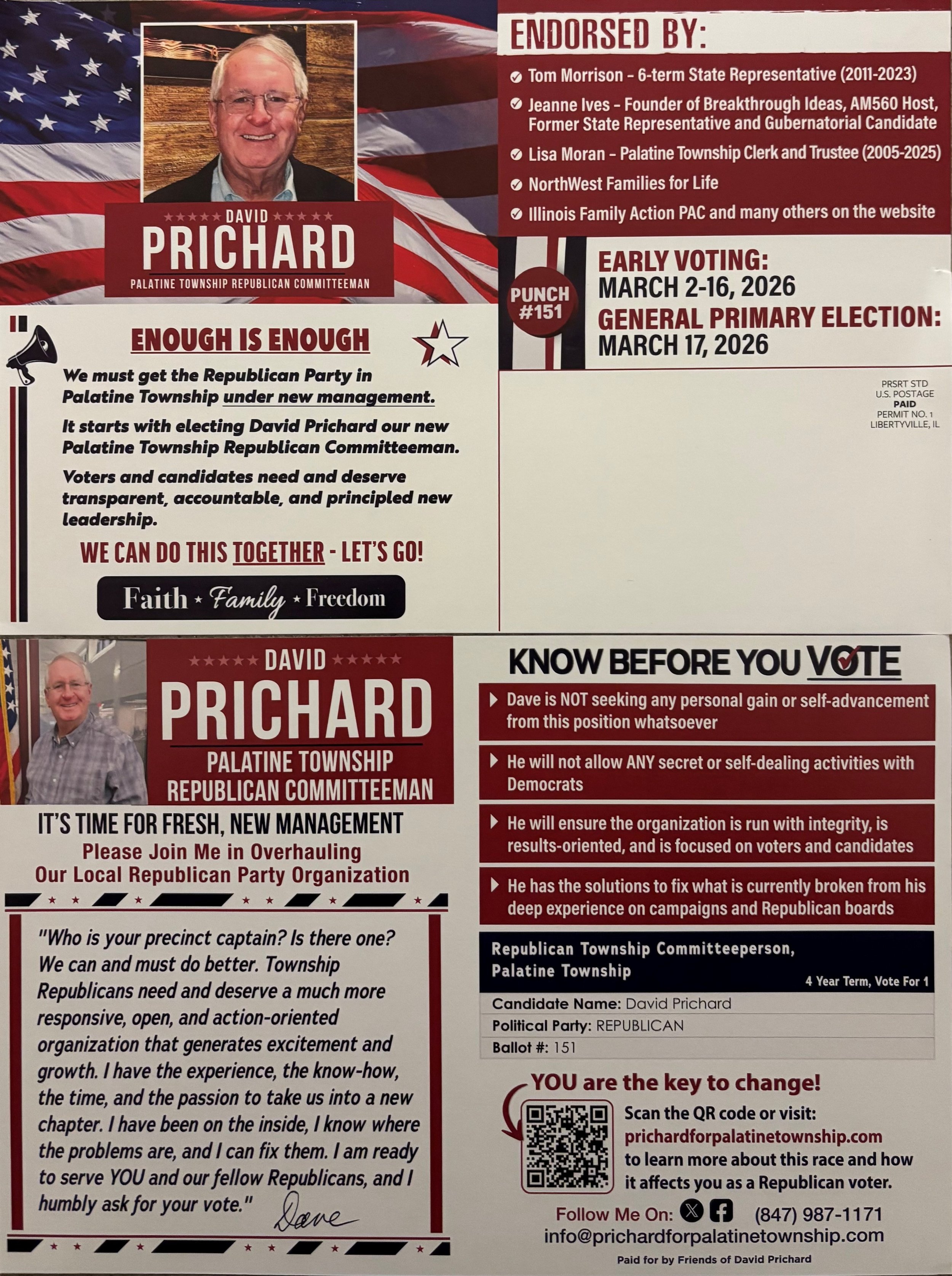 A 37-year resident of Palatine, Dave Prichard has been the man behind-the-scenes working tirelessly on many campaigns: knocking thousands of doors, advising candidates, developing strategy, recruiting volunteers, talking to voters about the issues, and getting out the vote.