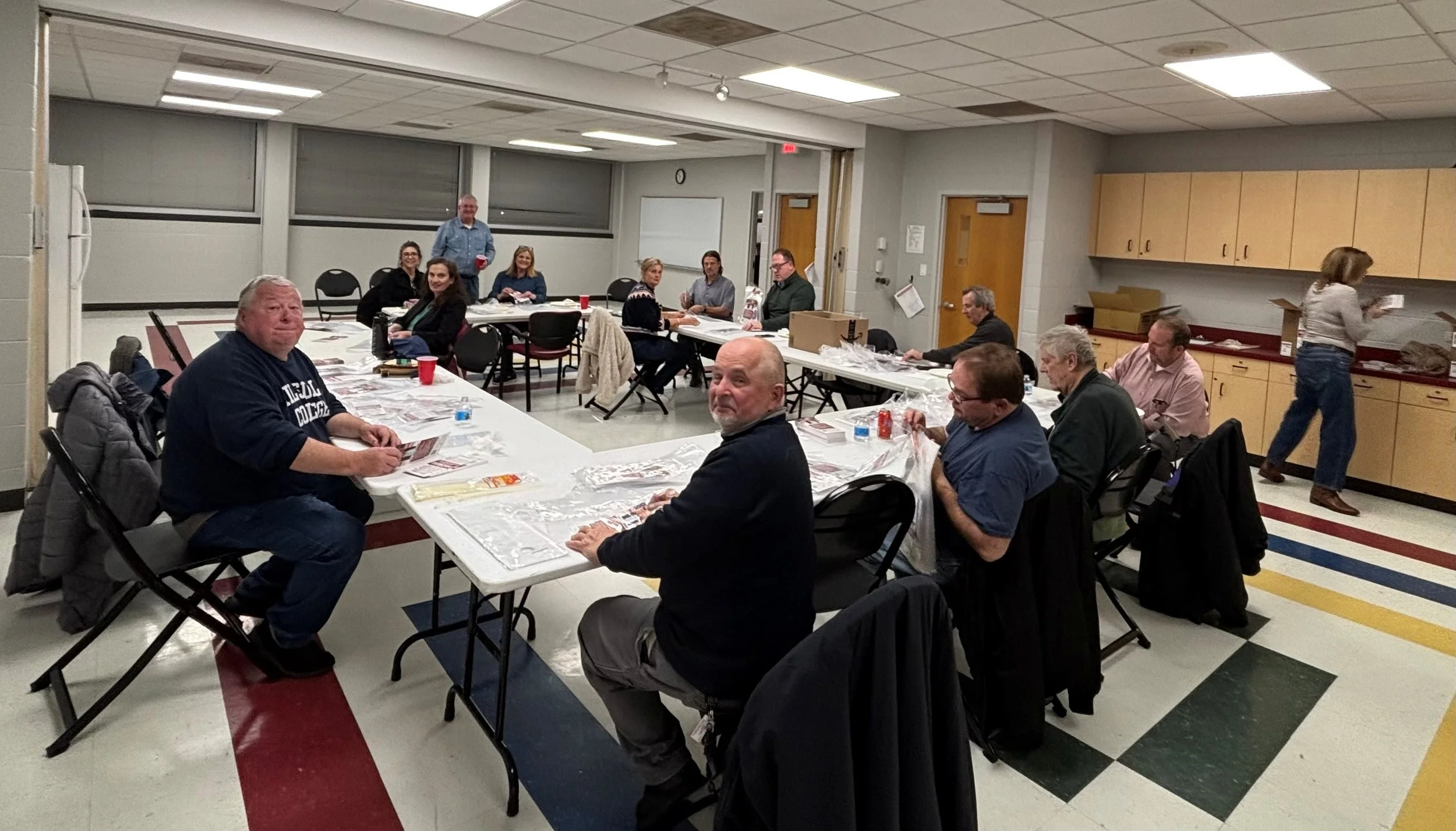 Enjoying delicious pizza, salad and dessert, the patriots placed walk cards in an amazing and estimated 2,800 plastic bags at the event, held at the Palatine Park District Community Center on Thursday, January 8.